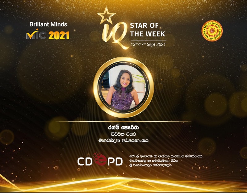Congratulations! IQ Star of the Week (13th – 17th Sept Week ) Ms. Rashmi Perera, 4th Year Student of the Department of Anthropology of the FHSS.