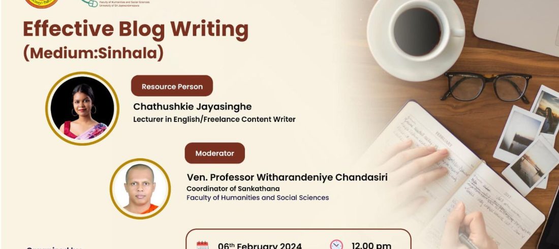 A workshop on ‘Effective Blog Writing’ organized by the publication committee of the Faculty of Humanities and Social Sciences is scheduled to be held on 6th February 2024 from 12.00 noon onwards at the Sumangala auditorium. The resource person of the workshop is Ms. Chathuskie...Read More
