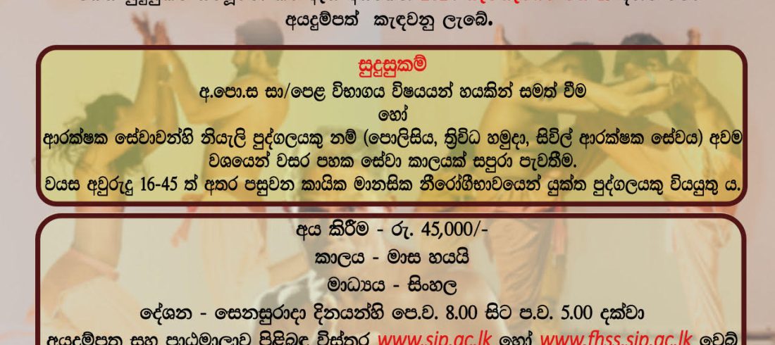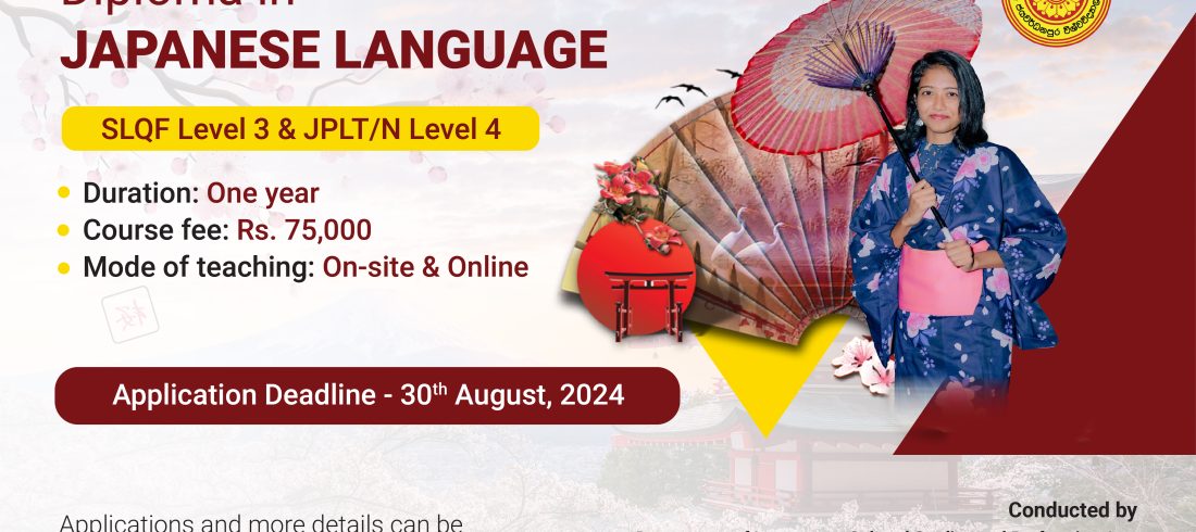 Complete the attached application and send to the following address on or before 30th August 2024 via registered post. Coordinator,Diploma in Japanese Language,Department of Languages, Cultural Studies and Performing Arts, Faculty of Humanities and Social Sciences,University of Sri Jayewardenepura,Gangodawila, Nugegoda. • Entrv QualificationPassed the GCE...Read More