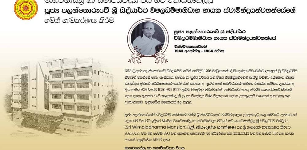 මානවශාස්ත්ර හා සමාජියවිද්යා පීඨ නව ගොඩනැගිල්ල පූජ්ය පලන්නොරුවේ ශ්රී සිද්ධාර්ථ විමලධම්මාභිධාන නායක ස්වාමීන්ද්රයන්වහන්සේගේ නමින් නාමකරණය කිරීම.