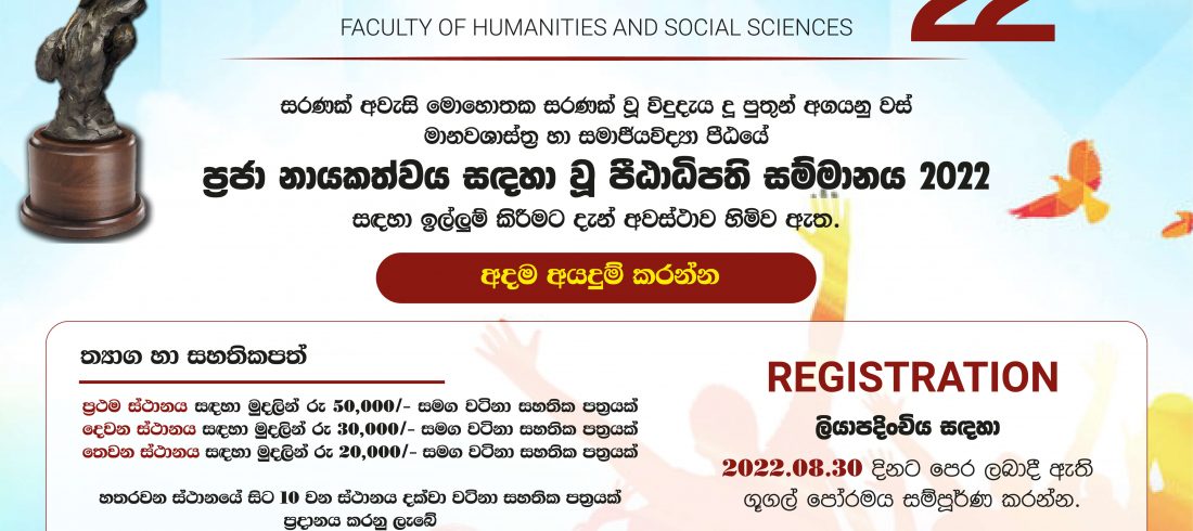 මානවශාස්ත්ර හා සමාජීයවිද්යා පීඨයේ ඩිජිටල් අධ්යාපන හා වෘත්තීය සංවර්ධන මධ්යස්ථානය සහ ශ්රී ජයවර්ධනපුර විශ්වවිද්යාලයීය පුස්තකාලය හා ඒකාබද්ධව ආරම්භ කිරීමට නියමිත පුස්තකාල හා විඥාපන විද්යා සහතික පත්ර පාඨමාලාව සඳහා අයදුම්පත් කැඳවේ. ප්රවේශය සඳහා අවශ්ය සුදුසුකම්: මානවශාස්ත්ර හා සමාජීයවිද්යා පීඨයේ පළමු වසර ශිෂ්යයෙක් හෝ ශිෂ්යාවක් වීම. මාධ්ය:...