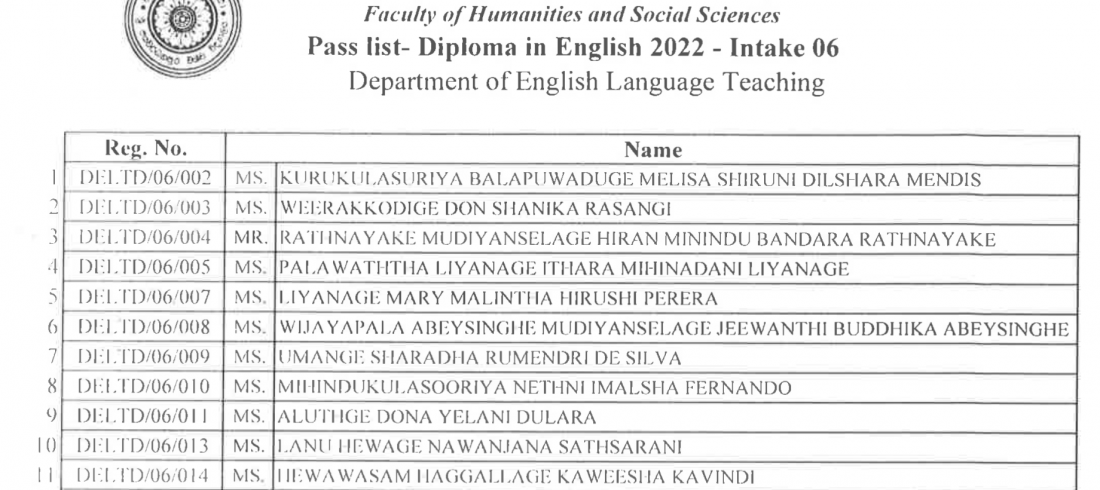 Pass list – Diploma in English 2022 – Intake 06 – Department of English Language Teaching