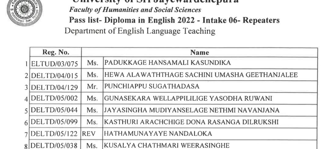 Pass list- Diploma in English 2022- Intake 06- Repeaters Department of English Language Teaching