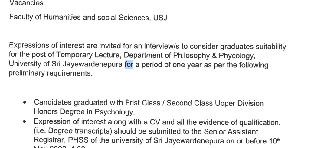 Vacancies for the Post of Temporary Lecture, Department of Philosophy & Psychology, Faculty of Humanities and social Sciences, USJ