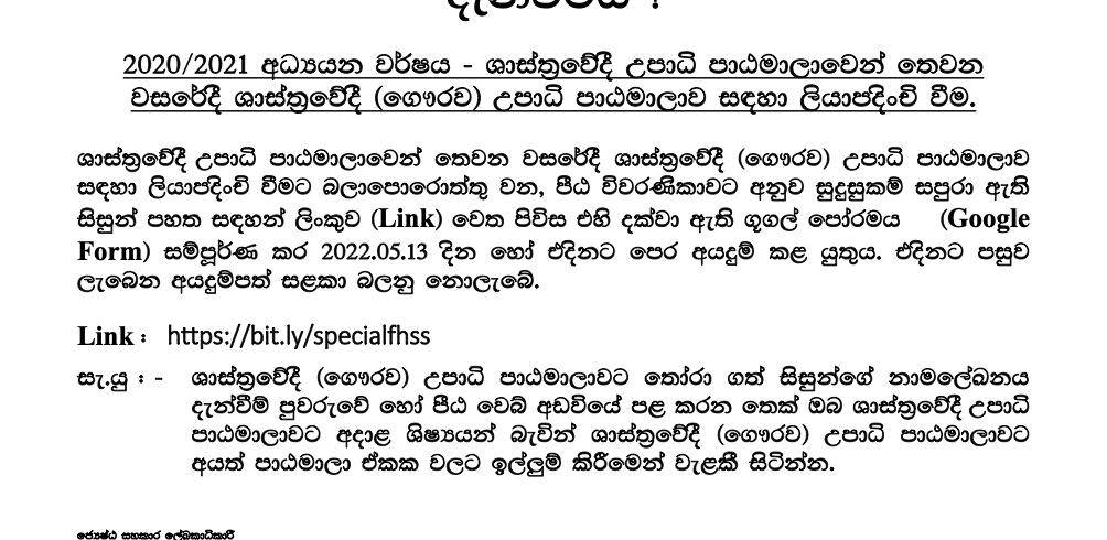 2020/2021 අධ්යයන වර්ෂය ශාස්ත්රවේදී උපාධි පාඨමාලාවෙන් තෙවන වසරේදී ශාස්ත්රවේදී (ගෞරව) උපාධි පාඨමාලාව සඳහා ලියාපදිංචි වීම