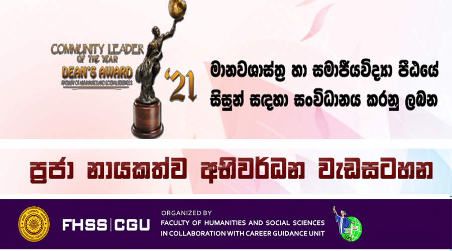මානවශාස්ත්ර හා සමාජීයවිද්යා පීඨයේ සිසුන් සඳහා සංවිධානය කරනු ලබන ප්රජා නායකත්ව අභිවර්ධන වැඩසටහන් මාලාව වැඩසටහන-01: Planning a community development project මාතෘකාව: ප්රජා සංවර්ධන වැඩසටහනක් නිවැරදිව සංවිධානය කරගන්නේ කෙසේද? දිනය: 2021 ඔක්තෝම්බර් මස 04 වැනි දින වේලාව: සවස 04 ට (04.00 pm) සම්පත් දායකත්වය: Dr. Janaka Fernando, Senior Lecturer, Department of Business Economics, Faculty of Commerce and Management Studies Zoom Link: Topic: How to manage a successful community service project...Read More
