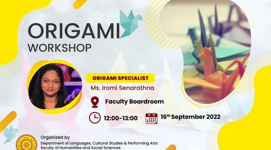 Organized by the Department of Languages, Cultural Studies and Performing Arts, Faculty of Humanities and Social Sciences to promote cultural awareness among the students who are studying Japanese for their degree. The resource Person for this workshop is Ms. Iromi Senarathna, who is a specialist in Origami and a very prominent figure in promoting the art of Origami in Sri Lanka. Date and Venue: Friday the 16th September 2022, 12:00-13:00...Read More
