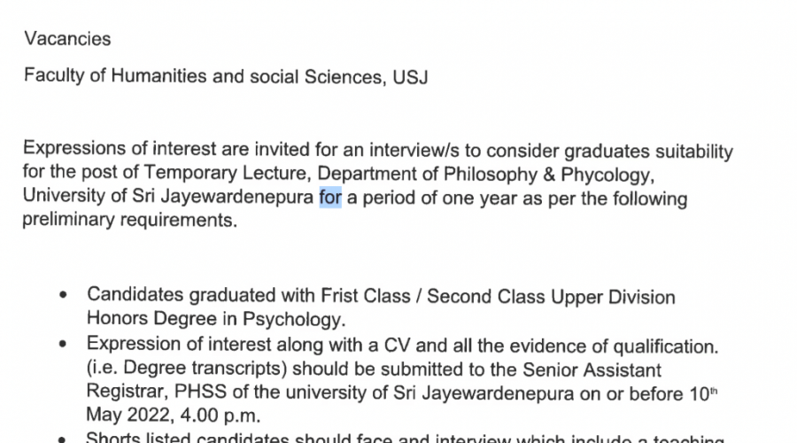 Vacancies for the Post of Temporary Lecture, Department of Philosophy & Psychology, Faculty of Humanities and social Sciences, USJ