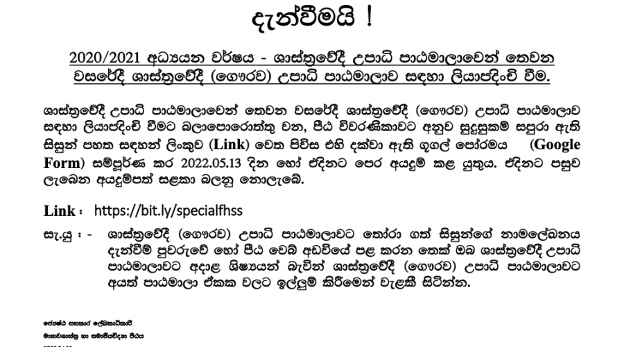 2020/2021 අධ්යයන වර්ෂය ශාස්ත්රවේදී උපාධි පාඨමාලාවෙන් තෙවන වසරේදී ශාස්ත්රවේදී (ගෞරව) උපාධි පාඨමාලාව සඳහා ලියාපදිංචි වීම