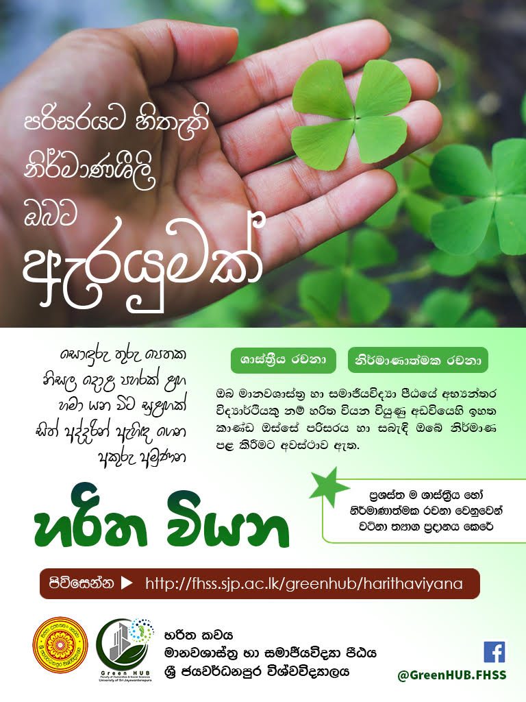 ඒ අනුව ඔබ මානවශාස්ත්ර හා සමාජීයවිද්යා පීඨයෙහි අභ්යන්තර විද්යාර්ථීයෙකු නම් හරිත වියන වියුණු අඩවියෙහි පරිසරය හා සබැඳි ශාස්ත්රීය රචනා සහ නිර්මාණාත්මක රචනා පළ කිරීමට දැන් අවකාශ සලසා ඇත. මෙහිදී ප්රශස්තම ශාස්ත්රීය හෝ නිර්මාණාත්මක රචනා වෙනුවෙන් වටිනා ත්යාග ප්රදානය කිරීමට ද අපේක්ෂා කෙරේ.