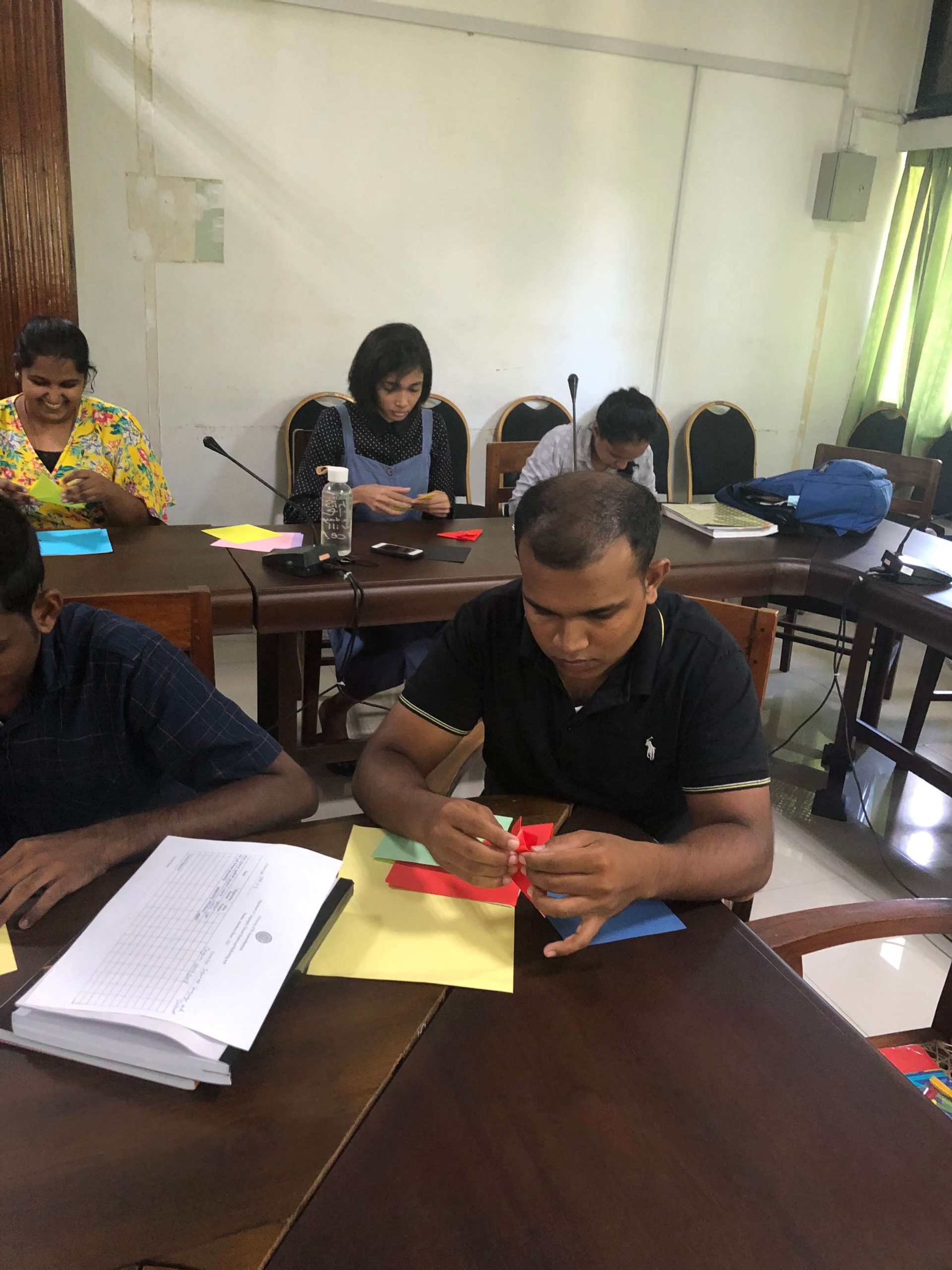 This was a co-curricular activity for the students who have registered for JPN 1213: Japanese Language and Culture. The objective of the program was to promote cultural awareness and to experience and understand Japanese way of thinking through the sophisticated art of origami. Though the time was only an hour, the participants could get to know a glimpse of Japanese way of expressing and recreating shapes and how they calculate and design in a way that everything fits into just the right place. Ms Iromi showed how additional steps could be used to original folding steps so that it could be arranged to bring out unique results. Everybody who participated including some faculty members ad nonacademic staff enjoyed making origami and we hope to have more workshops in the future.