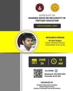 Workshop on Sharing Ideas on Inclusivity in Tertiary Education organized by the Academic Mentoring Committee of the Student Support Center, FHSS will be held on 26th June 2021.