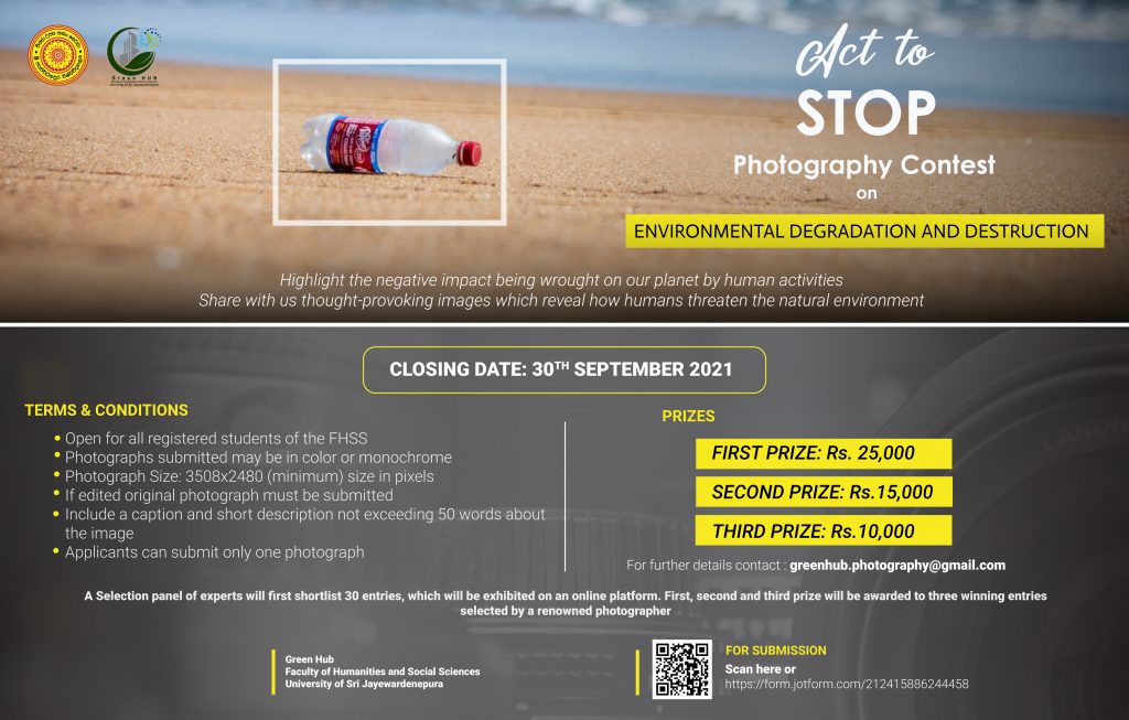 Act to Stop photograph competition is organized by the Innovation Team of the Green Hub of the Faculty of Humanities and Social Sciences. This competition intends to unlock the potential of the students in contributing to sustainable development. There is a need to develop student knowledge about human induced destruction of the environment through an effective mode of communication. Therefore, students are invited to showcase the consequences of environmental destruction through photography. The photographs can be on topics ranging from environmental pollution due to urbanization, industrialization to deforestation to global warming to threats to biodiversity. We hope that this competition will address the need for environment sustainability and prompt students to engage in individual and collective environment-sustainable actions.