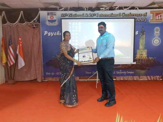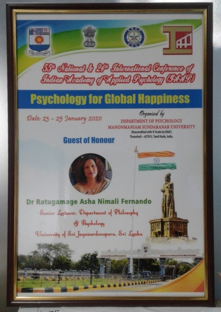 Dr. R. Asha Nimali Fernando, senior lecturer attached to the Department of Philosophy and Psychology of the Faculty of Humanities and Social Sciences was invited to deliver a guest speech at the 55th National & 24th International Conference of the Indian Academy of Applied Psychology. This conference was hosted by the Manonmaniam Sundaranar University in Tirunelveli, Tamil Nadu, along with the Indian Academy of Applied Psychology from 23rd January to 25th January 2020. The central theme of the conference was ‘Psychology for Global Happiness’. There, Dr. Asha Fernando presented a speech on ‘The Concept of Happiness’. For her performance on this topic, she received a gift of honor.