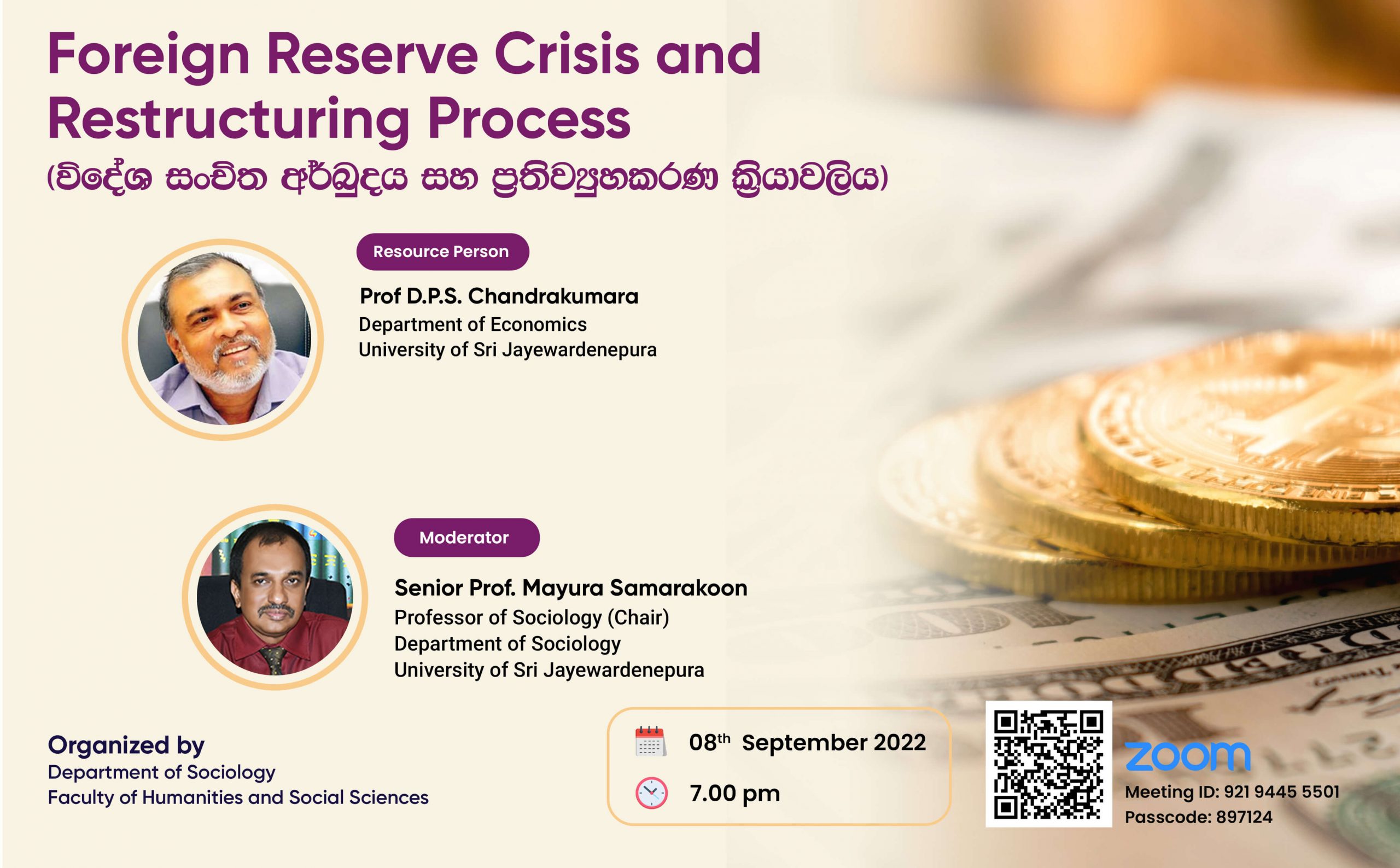 Topic: Foreign Reserve Crisis and Restructuring Process (විදේශ සංචිත අර්බුදය සහ ප්රතිව්යුහකරණ ක්රියාවලිය) Time: Sep 8, 2022 07:00 PM Colombo
