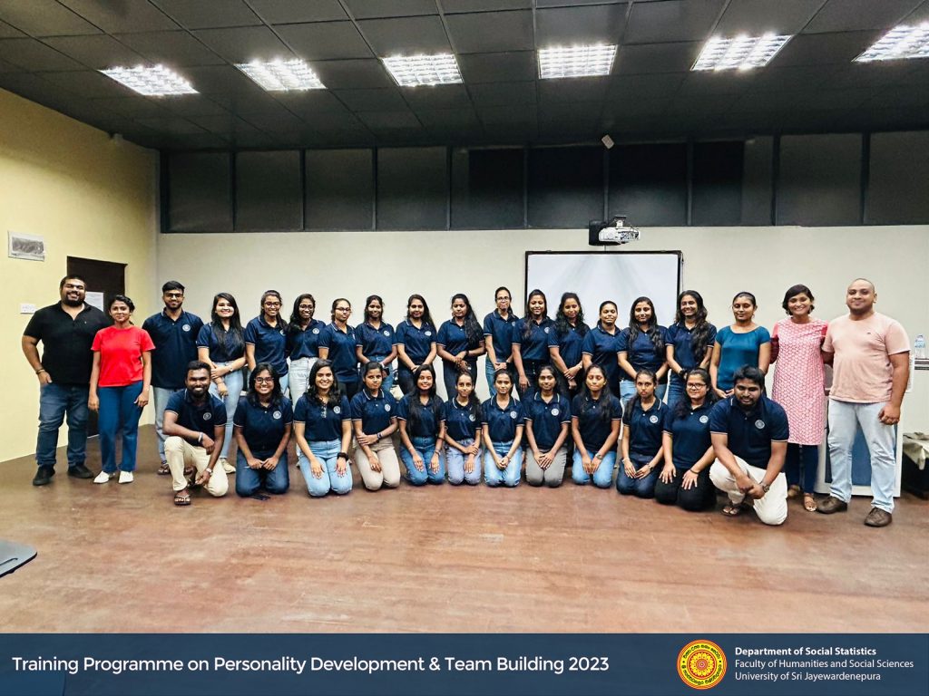 Professional development and team building are important for interns because they help to build essential skills and qualities that are necessary for success in any career. The Department of Social Statistics organized a Training Program on Personality Development & Team Building for the fourth-year students of the department who are ready for joining as interns upcoming semester onwards. The session took place on 12th June 2023 from 9 a.m. to 4 p.m. at the University premises. Mr. Ramzi Zaindeen and Ms. Thevuni Kotigala, two well-experienced professional consultants joined as the facilitators of the training program. This session, indeed, was help participants to reflect, grow self-awareness, and learn new interpersonal skills.