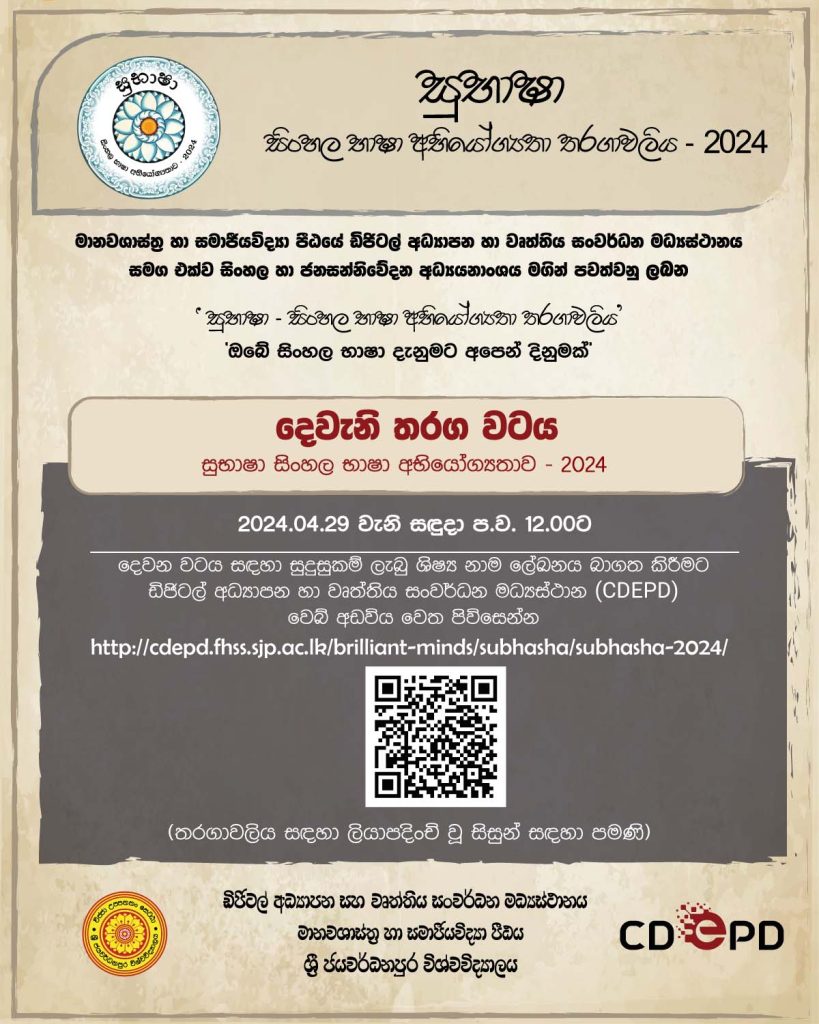 වැඩි විස්තර සඳහා පිවිසෙන්න: http://cdepd.archive.fhss.sjp.ac.lk/brilliant-minds/subhasha/subhasha-2024/