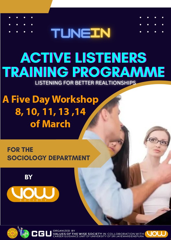 Let’s tune your listening skills up with Tune In Active Listeners Training Program Conducted by VOW Society. A five-day workshop will be held on the 8th, 10th, 11th, 12th, and 13th of March Especially for the Department of Sociology of FHSS.